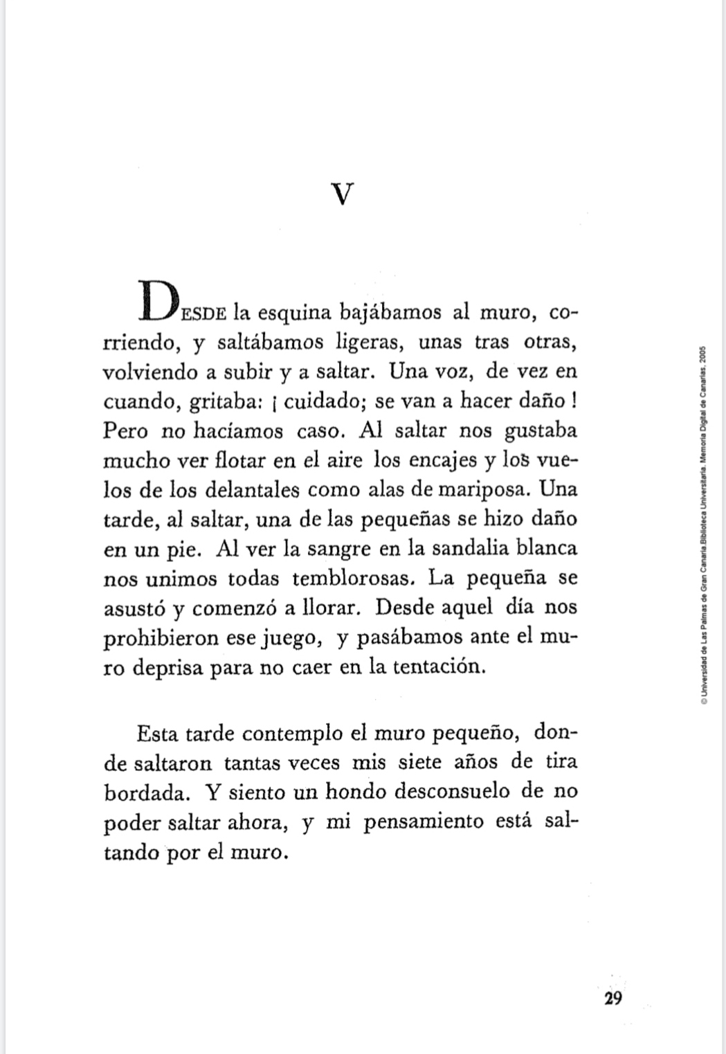 Así que me decidí por "Y mi pensamiento está saltando por el muro", un fragmento extraído del poemario autobiográfico de Josefina de la Torre Versos y Estampas (1927).