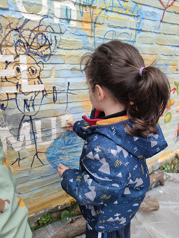 I proposed to make the mural from the drawings and tracings of two to three year olds who knew her. Free creations, not guided by the hand of an adult, produced by their little hands. I made a composition from fragments of their drawings, whose essence I wanted to convey as faithfully as possible. I focused on the harmony of the composition, the colours and the scale of the elements chosen. I wanted to capture that moment of childhood to which she had arrived, and make this mural a living, happy, colourful and energetic tribute.